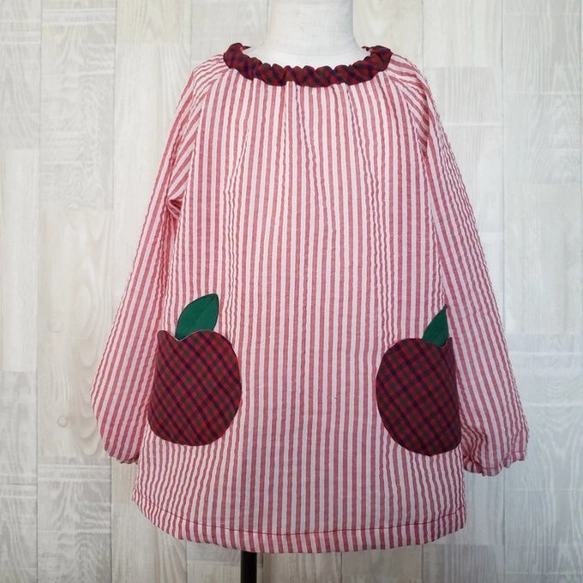 【80~160】りんごポケット レッド チェック リップル 長袖スモック 首パイピング
