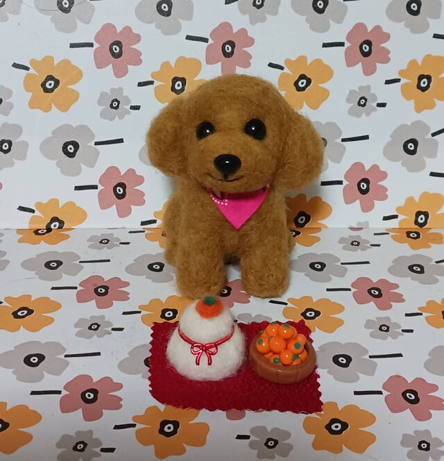 茶色の羊毛フェルト犬とお正月飾りのセット。