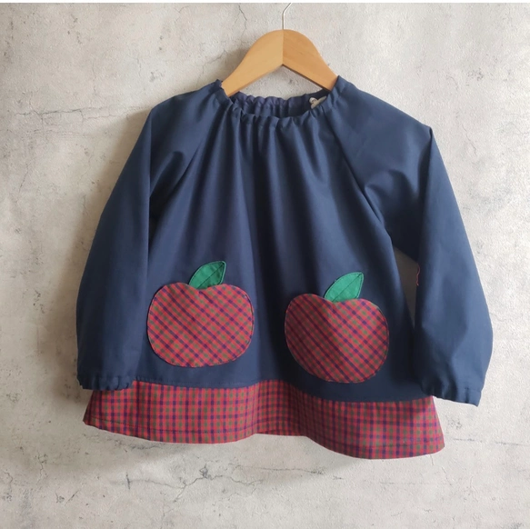 【80~160】りんごポケット レッドチェック ネイビー 長袖スモック 裾切替 着丈延長可