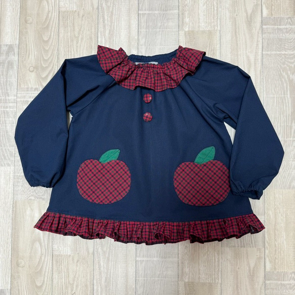 【80~160】りんごポケット タータンチェック 赤 襟裾フリル 長袖スモック くるみボタン 着丈延長可