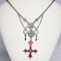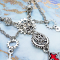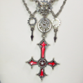 紅く染められた大きなゴシック調の逆さ十字架(逆ロザリオ)と歯車を組み合わせたスチームパンク風ペンダント・ネックレスです