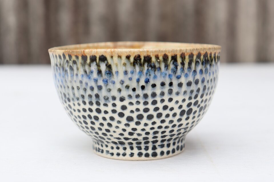 小鉢 開花③いつも丁寧な対応に、素敵な品で感謝です。 手に取って心地良い存在感に、花弁広がる縁が可愛くて、見てて飽きないいっぱいの点々が楽しいです。 入れたものが美味しく映える黒が、独特の輝きでカッコええです。 またお気に入りが増え嬉しく、ありがとうございます。