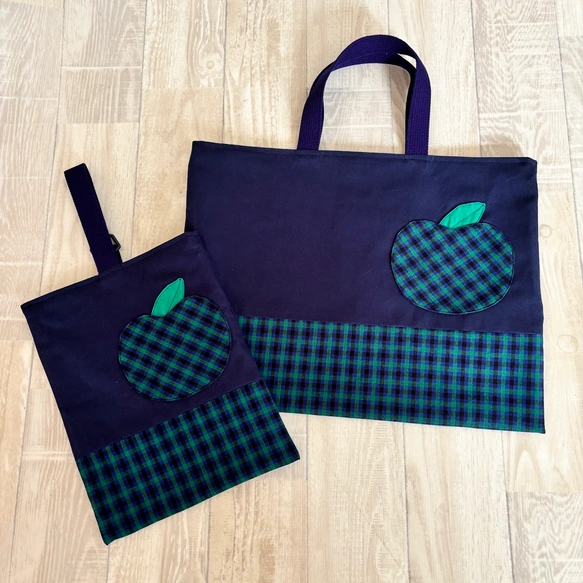 2点セット レッスンバッグ 上履き入れ りんご グリーンチェック 裏地 帆布