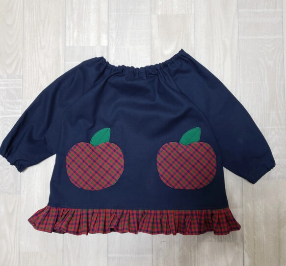 【80~160】りんごポケット レッド チェック ネイビー 裾フリル 長袖スモック 着丈延長可