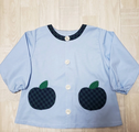 【*80~160】りんごポケット グリーン チェック サックス 前ボタン 4つ 長袖スモック 首パイピング 着丈延長可