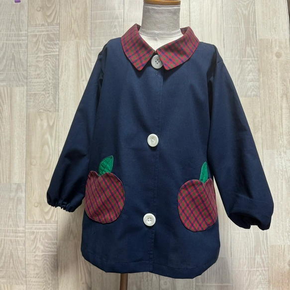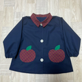 【80~160】りんごポケット レッド チェック ネイビー 前ボタン 長袖スモック 襟付き 着丈延長可