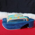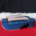 下駄を焼いて木目を出しているので、立体的で木目が美しいです。絶妙な色加減で青系統の異なる色を幾度も塗り重ね、下の色を研ぎ出しました。