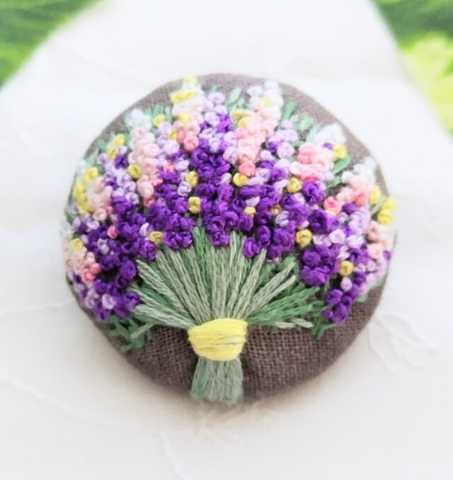 ブラウングレーの綿リネン生地に紫色の小花の花束をイメージしています。