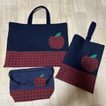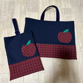 2点セット レッスンバッグ 上履き入れ りんご レッドチェック 裏地 帆布