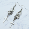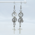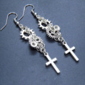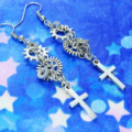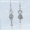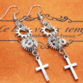 アンティークシルバーのロザリオ(十字架)と歯車と組合せたスリムでコンパクトなスチームパンク風ピアスです