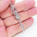 ベーシックなロザリオと形状の異なる歯車を2つ使用して縦に吊り下げる長めの仕上がりになっています