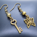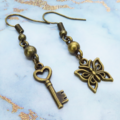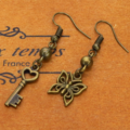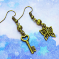 アンティークゴールドカラーの蝶のモチーフとハートのついたカギのモチーフを組合せたアシンメトリーピアスです