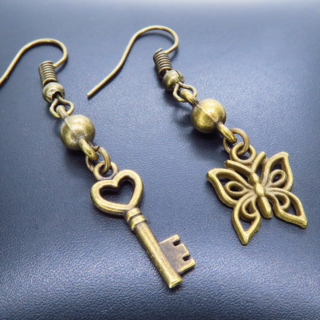 アンティークゴールド 蝶とカギのシンプルなアシンメトリーピアス イヤリング