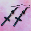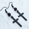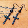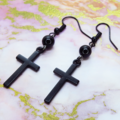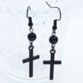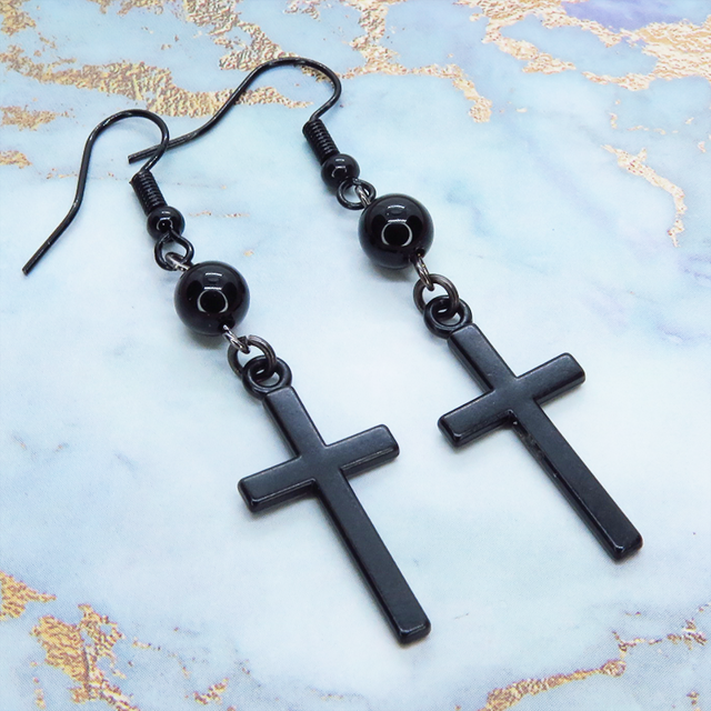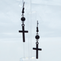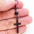 黒のロザリオ(十字架)と黒く輝くオニキスを組合せたシンプルでスマートなブラックピアスです