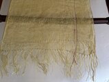 手織りヘンプ100%、染め/エンジュ(黄色)1本だけ経糸に藍〜赤のグラデーション糸が入っていてアクセントに。使っているうちに、ガーゼのような肌触りになります。年間通してお使いいただけます。夏場は日よけ・冷房よけに、冬場はシャツの中に入れて暖か。サイズ:140×25センチ(手作りのため多少サイズが変わります)男女兼用