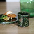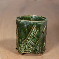 鉄分の多い赤土板で湯のみを作り、表面に凹凸模様と印かを押して、乾いたら素焼きをし、織部釉薬を塗って模様部分の釉薬をはがして本焼きをします。