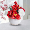 和の雰囲気のある丸い花器に赤い寒椿と白い菊、南天、