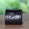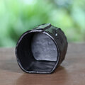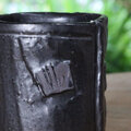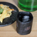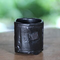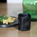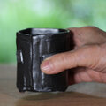 焼き上がった湯のみは重厚な黒色、茶色い部分がポイントになって素敵です。