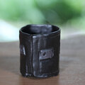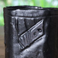 鉄分の多い赤土板で湯のみを作り、表面に凹凸模様と印かを押して、乾いたら素焼きをし黒釉薬を塗って、模様部分の釉薬をはがして本焼きをします。