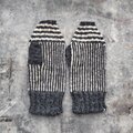 2色の糸を、ストライプ柄とボーダー柄の組み合わせで編みました。2本の糸を交互に編むことで厚みが出て、さらにあたたかく。