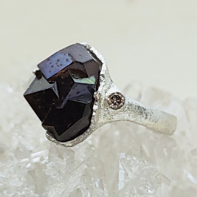 奈良県産レインボーガーネットのシルバーリング*複数の結晶が集ったミニクラスターのような原石は山脈を思わせるような力強いフォルム、脇にはアクセントにシャンパンブラウンダイヤを添えました*ブラウンを基調にした郷愁を感じる色合いのメタリックなイリデッセンス、所々グリーンやパープル、ブルーなどの色合いも感じられる原石フリーフォームをお楽しみ下さい*リングは鋳肌のようなマット仕上げ、10~16号(推奨サイズ)の範囲を目安に調整可能、サイズ確定後に爪と伏せ込みで石留め致します*通常、黒化遅延処理を施しますが銀そのものの変化をお好みの場合は処理不要とお申し付けください*黒化防止ロジウム(最終画像下段色味参照)など各種コーティングご希望の場合は承ります(オプション1000円)