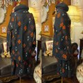深い黒の地に、温かみのあるオレンジと赤の幾何学模様が浮かび上がるアンサンブル。