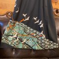 鮮やかな翡翠色の文様と、優雅に空を舞う鶴たちが描かれた、モダンで華やかなリメイクドレスです。幾何学的な花文様が万華鏡のように広がり、その上を真っ白な鶴が飛び交う、動きのあるドラマチックな意匠です。凛としていて、どこか新しい。そんな魅力を放つ逸品です。