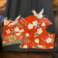 燃えるような朱色と黄金の雲取り、そして寄り添い舞う鶴たちが描かれた、豪華絢爛なリメイクドレスです。 黒・赤・金の王道カラーが、和の美しさを引き立てます。緻密な金彩が光を反射し、歩くたびにドラマチックな輝きを放つ。