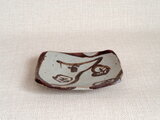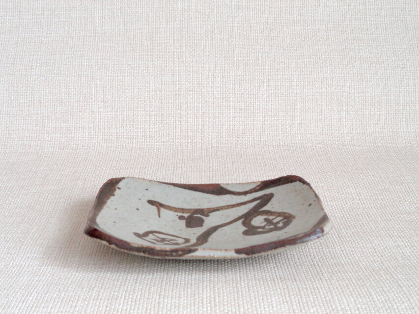 この作品は、信楽の土を使いろくろで作った長方皿に丁寧に梅を手描きし焼成を重ねています。