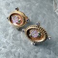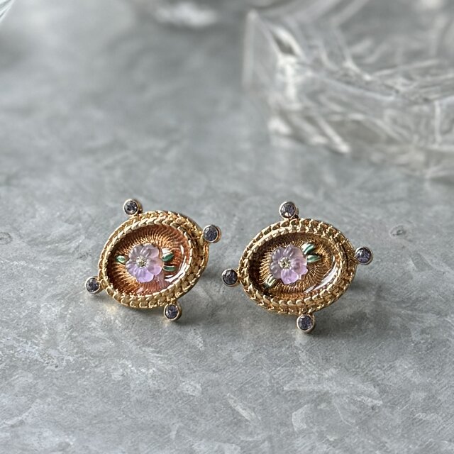 半透明になったアメジストカラーのルーサイトフラワー、煌めくクリアなラインストーンを中央にセット。グリーンのエナメルがさりげなくアクセントになっています。
