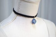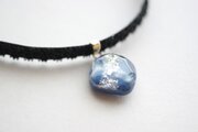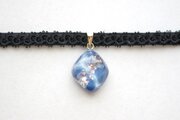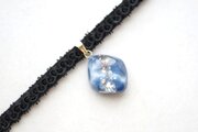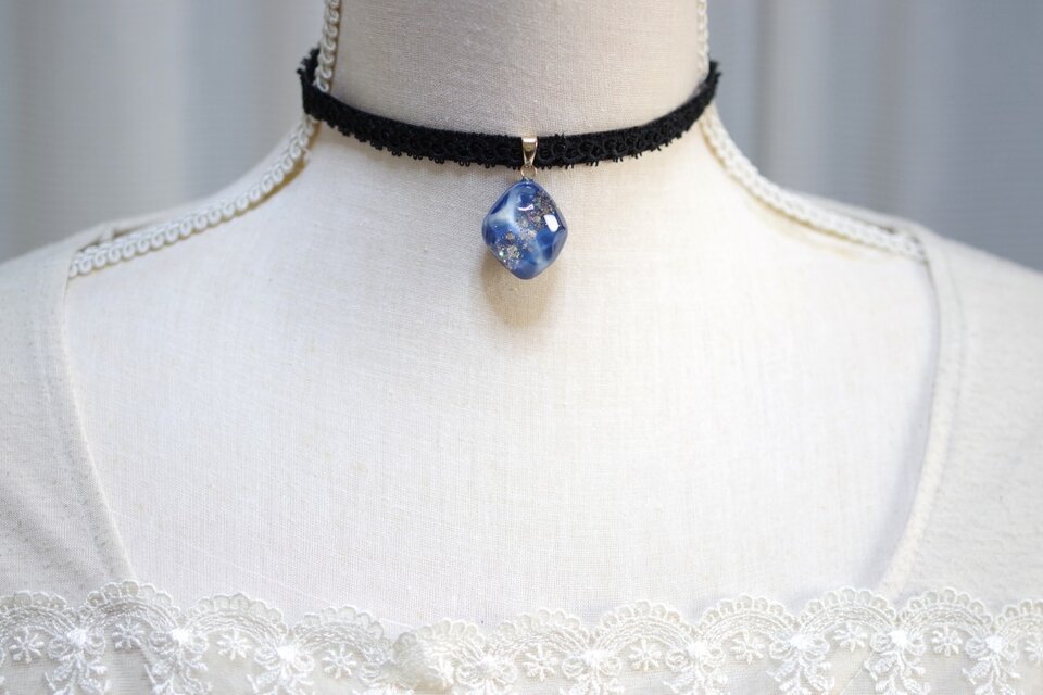 コバルトブルーとホワイトのマーブル模様と、きらめくラメが華やかで美しいレジンを、ベルベットリボンにタティングレースで装飾を施したチョーカーに仕上げました。
