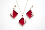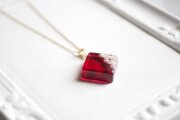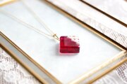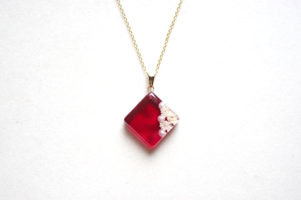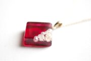 パールとお花をスクエア型のレジンに封じ込め、ピンクで着色したペンダント。