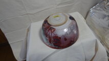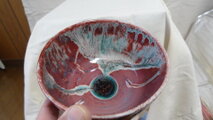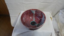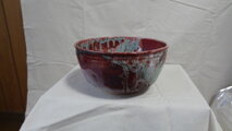 やわらかい乳白釉と辰砂釉の組み合わせ、還元で流下させた。