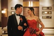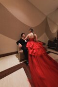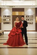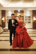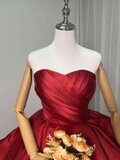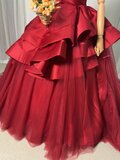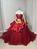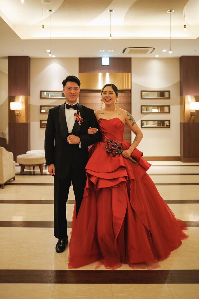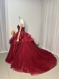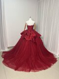 実例写真!カラードレス ボルドー色 ベアトップ ラッフルフリル プリンセスライン 花嫁 編み上げ