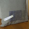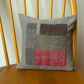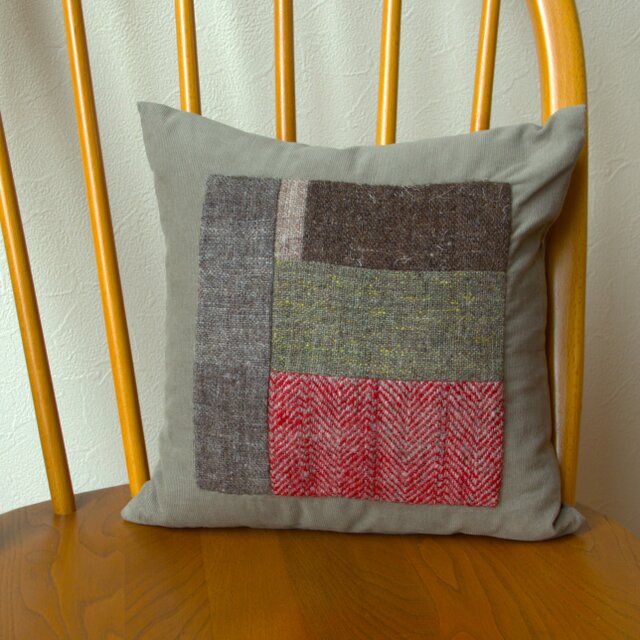 市販のコーデュロイの生地にホームスパンの端切れをアップリケしたクッションです。