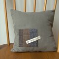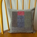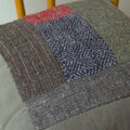市販のコーデュロイの生地にホームスパンの端切れをアップリケしたクッションです。