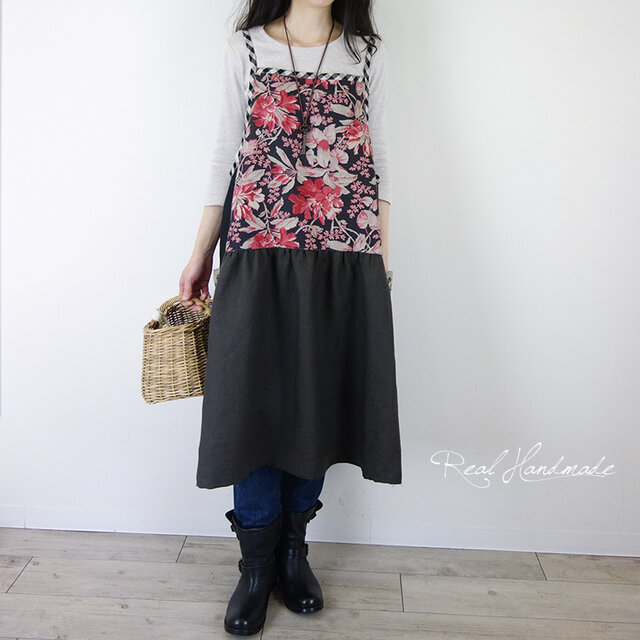 大変美しいリネンブラックレッドフラワーと