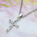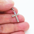 清潔感のあるシルバーカラーの台座にまばゆいラインストーンを隙間なく敷き詰めたロザリオをあわせました