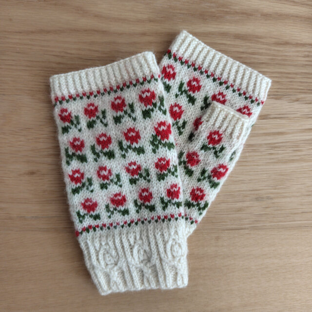 カフスには、花の蕾のような模様をねじったゴム編みで、手の甲とひら全体には赤い花を編み込みました。
