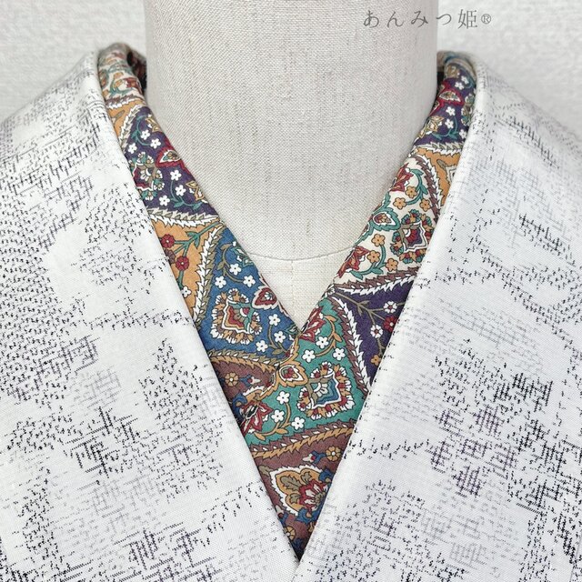 現代風のデザインの半衿をごく地味な衿の襦袢に溜めるだけで、少し奇抜な配色の着流しの印象を引き締めてくれました。 年末の注文でしたがすぐ送っていただけたので、新年会で着ていく時に活用できました。ありがとうございます。
