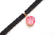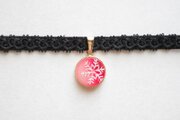 鮮やかなレッドのグラデーションにパールホワイトの雪の結晶が映えるレジンを、ベルベットリボンにタティングレースで装飾を施したチョーカーに仕上げました。
