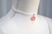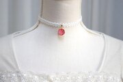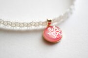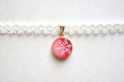 鮮やかなレッドのグラデーションにパールホワイトの雪の結晶が映えるレジンを、サテンリボンにタティングレースで装飾を施したチョーカーに仕上げました。