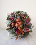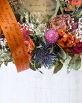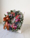 *こちらのアレンジは、ドライフラワーを使い制作しています。ドライフラワーは、非常にデリケートな素材です。お取り扱いは、優しく丁寧にお願い致します。ドライフラワーは、概ね半年程で退色が始まります。早いものでは、1~2カ月で退色する物もあります。これも自然の移ろいとご理解頂き、時間の経過と共にアンティーク調に変化して行くその経過もお楽しみ頂ければ嬉しいです。高温多湿・直射日光・ドア等の衝撃を避けた、風通しの良い室内に飾ってお楽しみ下さい。お好みにもよりますが、ドライフラワーは1年程がお取替え時期になります