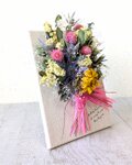 ハガキサイズ程のキャンバスボードに、ドライフラワーでブーケをアレンジしました。