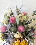 *こちらのアレンジは、ドライフラワーを使い制作しています。ドライフラワーは、非常にデリケートな素材です。お取り扱いは、優しく丁寧にお願い致します。ドライフラワーは、概ね半年程で退色が始まります。早いものでは、1~2カ月で退色する物もあります。これも自然の移ろいとご理解頂き、時間の経過と共にアンティーク調に変化して行くその経過もお楽しみ頂ければ嬉しいです。高温多湿・直射日光・ドア等の衝撃を避けた、風通しの良い室内に飾ってお楽しみ下さい。お好みにもよりますが、ドライフラワーは1年程がお取替え時期になります