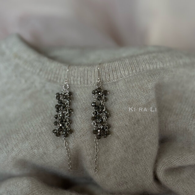小粒のパイライトを連ねて、キラキラと揺れるピアスに仕立ててみました。