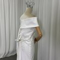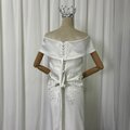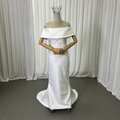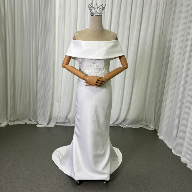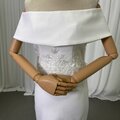 ウェディングドレス 取り外しオフショルダー スレンダーライン 繊細レース クレープ生地 ミニトレーン 編み上げ 2次会