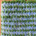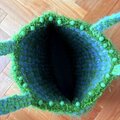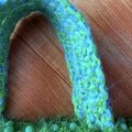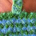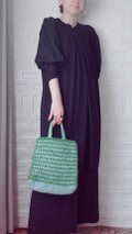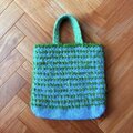 グリーンの毛羽立ち糸と、色んな水色の糸で模様に編んでトートバッグができました!