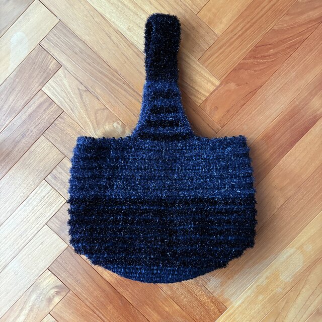 底から、黒いペーパーラフィアと丈夫なウールなどの糸を編んでいき、黒とグレーのシャリ感のあるキラキラ糸をボーダーに。持ち手は一本でショルダーにも腕に掛けても使いやすくかわいいです❤︎