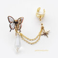 蝶々と透明の雫型ビーズが揺れるネジバネ式イヤリングとビーズと星モチーフが揺れるイヤーカフを2本のチェーンで繋げました